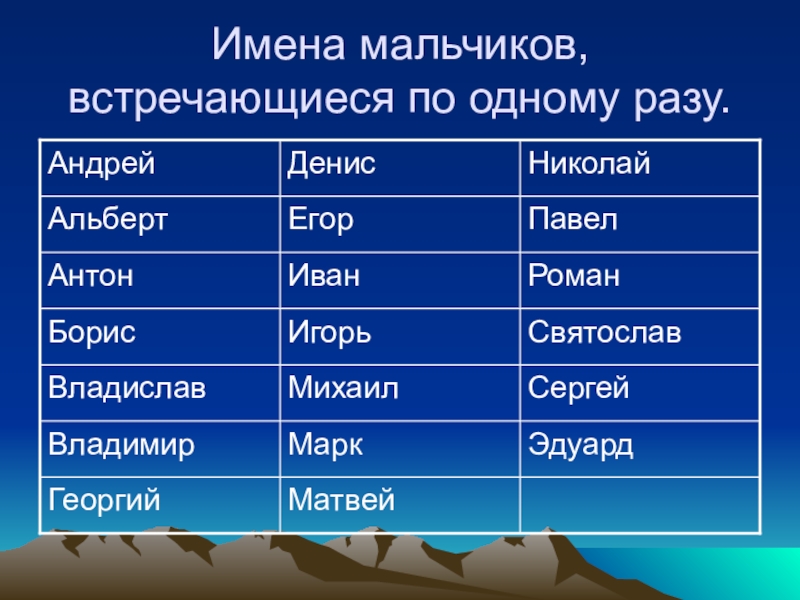 Слайд 9Имена мальчиков, встречающиеся по одному разу.
