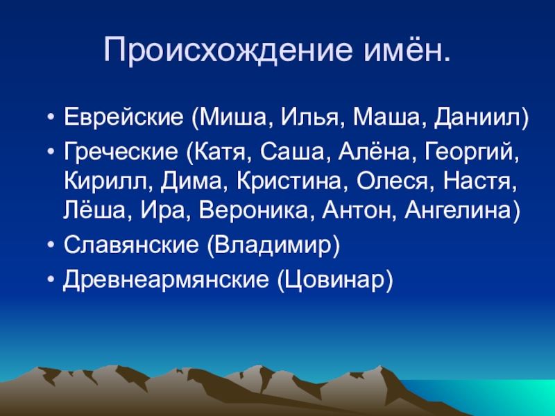 Происхождение имён.Еврейские (Миша, Илья, Маша, Даниил)Греческие (Катя, Саша, Алёна, Георгий, Кирилл, Дима, Кристина, Олеся, Настя, Лёша, Ира,