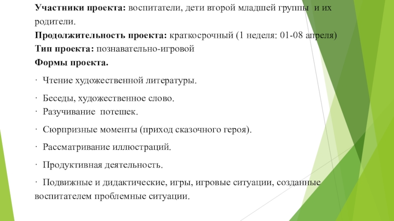 Продолжительность проекта: краткосрочный (1 неделя: 01-08 апреля) Тип проекта: познавательно-игровой Формы проекта.