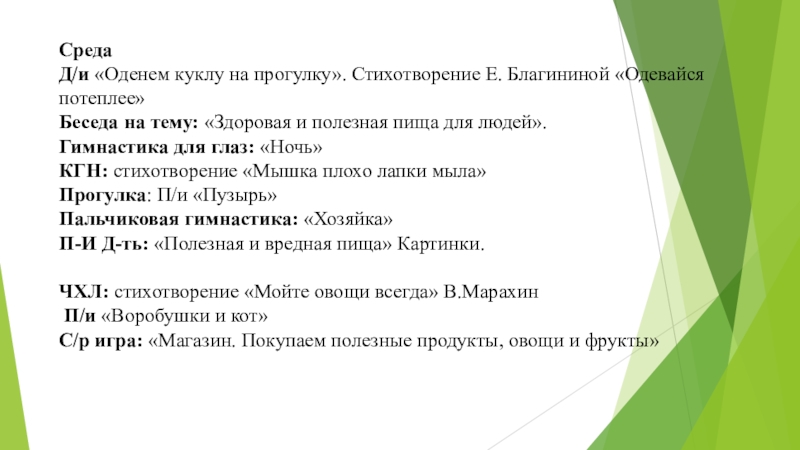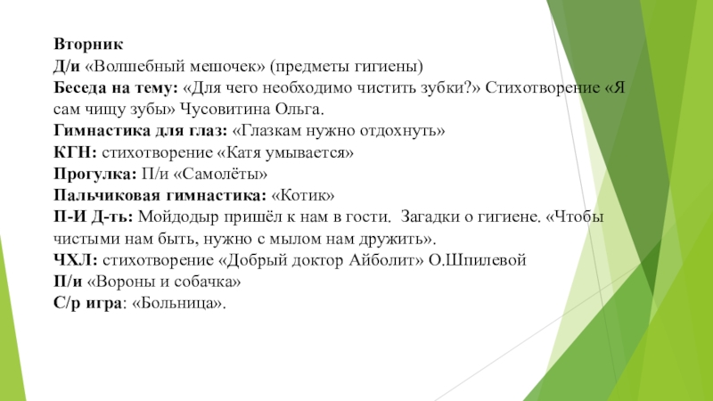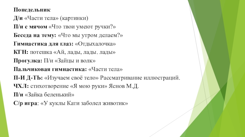 Д/и «Части тела» (картинки) П/и с мячом «Что твои умеют ручки?» Беседа на тему: «Что мы утром делаем?» Гимнастика для глаз: «Отдыхалочка» КГН: потешка «Ай, лады, лады. лады» Прогулка: П/и «Зайцы и волк» Пальчиковая гимнастика: «Части тела» П-И Д-ТЬ: «Изучаем своё тело» Рассматривание иллюстраций. ЧХЛ: стихотворение «Я мою руки» Яснов М.Д. П/и «Зайка беленький» С/р игра: «У куклы Кати заболел животик»