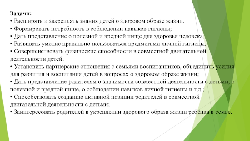 • Дать представление родителям о значимости совместной деятельности с детьми, о полезной и вредной пище, о соблюдении навыков личной гигиены и т.д.;
