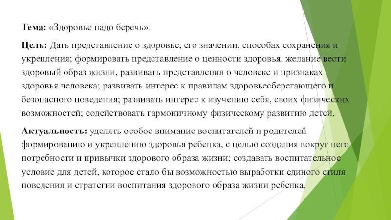 Актуальность: уделять особое внимание воспитателей и родителей формированию и укреплению здоровья ребенка, с целью создания вокруг него потребности и привычки здорового образа жизни; создавать воспитательное условие для детей, которое стало бы возможностью выработки единого стиля поведения и стратегии воспитания здорового образа жизни ребенка.