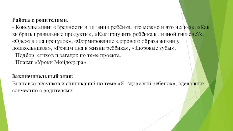 что нельзя», «Как выбрать правильные продукты», «Как приучить ребёнка к личной гигиене?», «Одежда для прогулок», «Формирование здорового образа жизни у дошкольников», «Режим дня в жизни ребёнка», «Здоровые зубы».