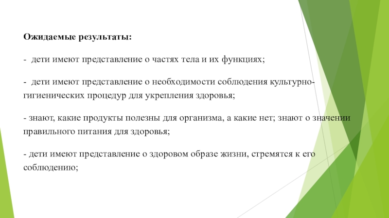 сохранения и укрепления; формировать представление о ценности здоровья, желание вести здоровый образ жизни, развивать представления о человеке и признаках здоровья человека; развивать интерес к правилам здоровьесберегающего и безопасного поведения; развивать интерес к изучению себя, своих физических возможностей; содействовать гармоничному физическому развитию детей.