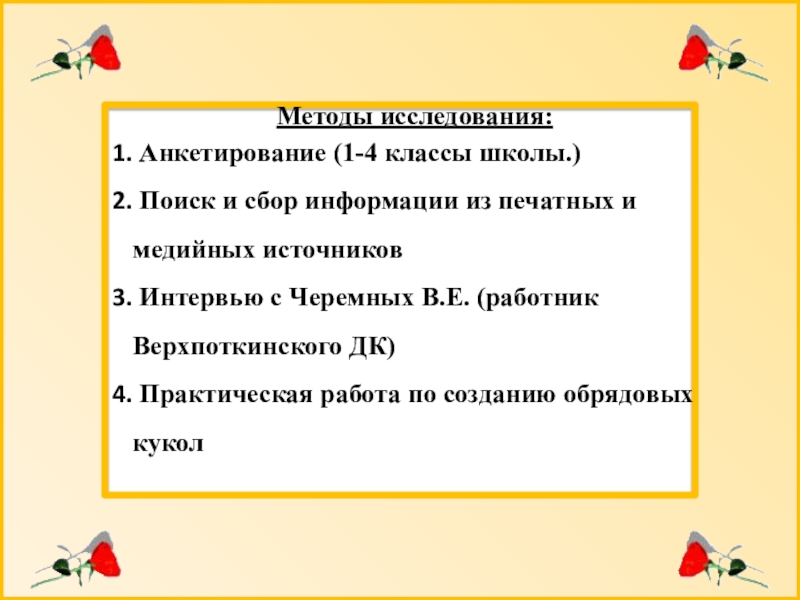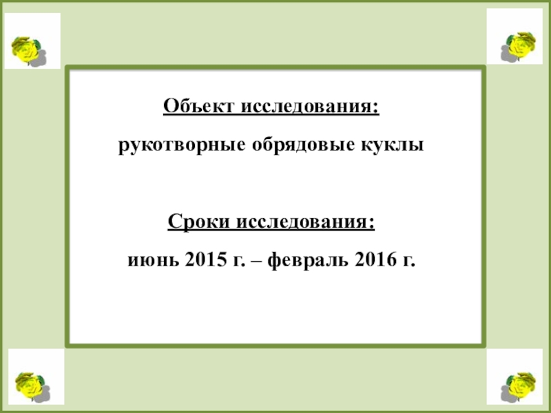 Объект исследования: рукотворные обрядовые куклыСроки исследования: июнь 2015 г. – февраль 2016 г.