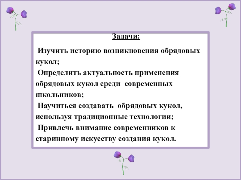 Задачи: Изучить историю возникновения обрядовых кукол; Определить актуальность применения обрядовых кукол среди современных школьников; Научиться создавать обрядовых