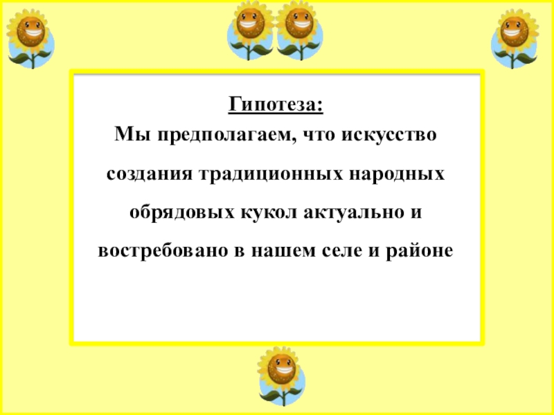 Гипотеза:Мы предполагаем, что искусство создания традиционных народных обрядовых кукол актуально и востребовано в нашем селе и районе