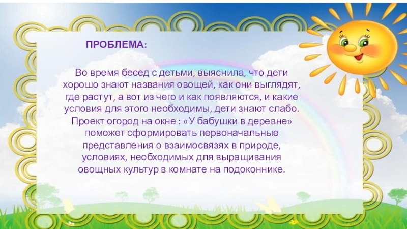 Проект огород на окне : «У бабушки в деревне» поможет сформировать первоначальные представления о взаимосвязях в природе, условиях, необходимых для выращивания овощных культур в комнате на подоконнике.