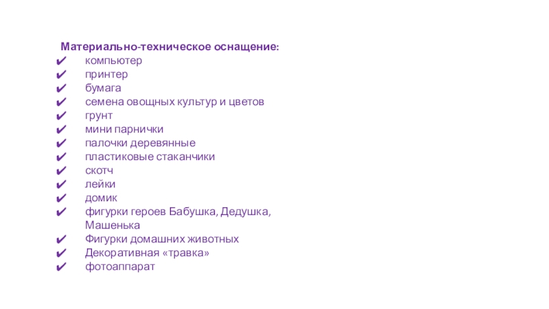 Приобрести семена овощных культур, землю, изготовить атрибуты для оформления огорода