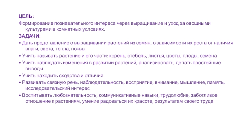 • Дать представление о выращивании растений из семян, о зависимости их роста от наличия влаги, света, тепла, почвы