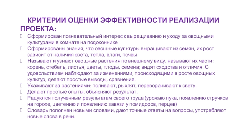 Сформированы знания, что овощные культуры выращивают из семян, их рост зависит от наличия света, тепла, влаги, почвы.