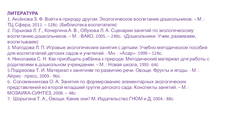 1. Аксёнова З. Ф. Войти в природу другом. Экологическое воспитание дошкольников.