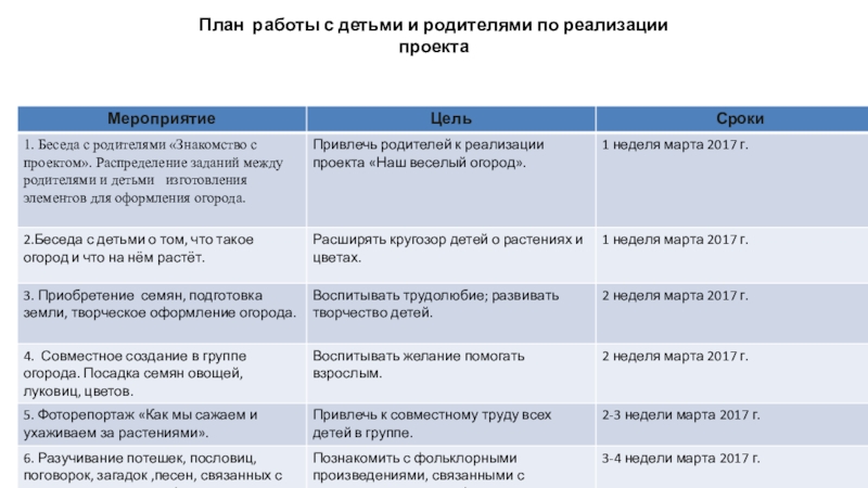 Слайд 22План работы с детьми и родителями по реализации проекта
