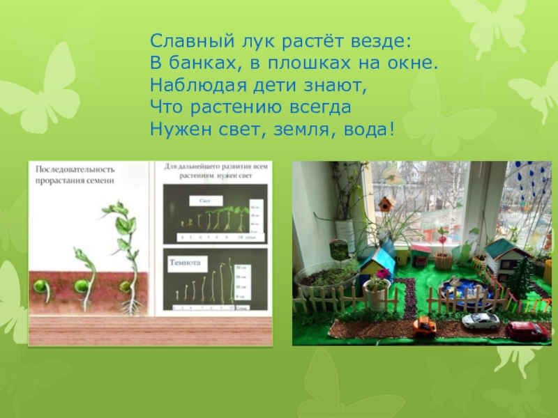 - педагог с детьми проводит опыт с луком, где наблюдается разница роста и развития растения в зависимости от условий;