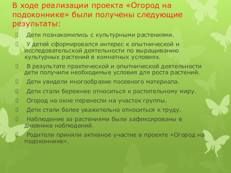 Слайд 23В ходе реализации проекта «Огород на подоконнике» были получены следующие результаты: