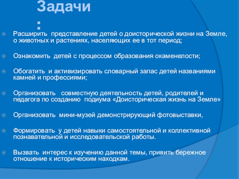 Организовать совместную деятельность детей, родителей и педагога по созданию подиума «Доисторическая жизнь на Земле»