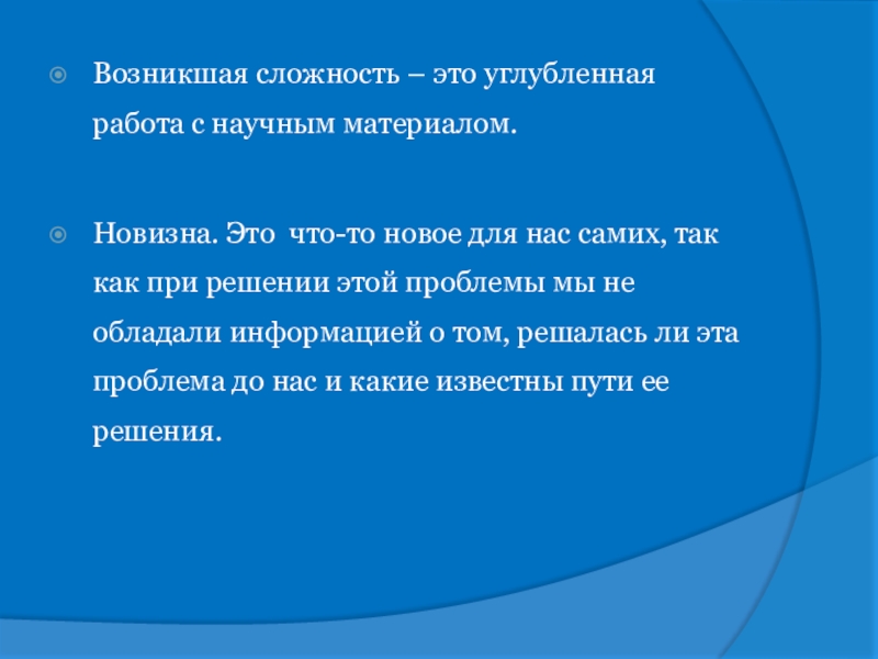 Слайд 22Возникшая сложность – это углубленная работа с научным материалом.