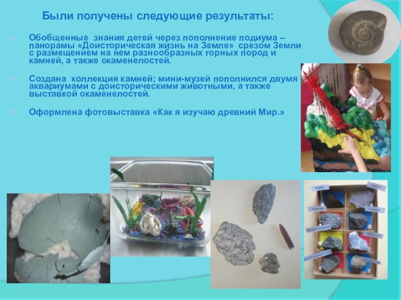 Создана коллекция камней; мини-музей пополнился двумя аквариумами с доисторическими животными, а также выставкой окаменелостей.