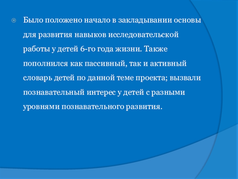 Слайд 23Было положено начало в закладывании основы для развития навыков исследовательской работы