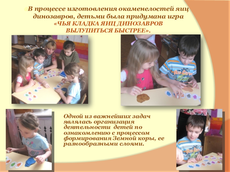 Одной из важнейших задач являлась организация деятельности детей по ознакомлению с процессом формирования Земной коры, ее разнообразными слоями.