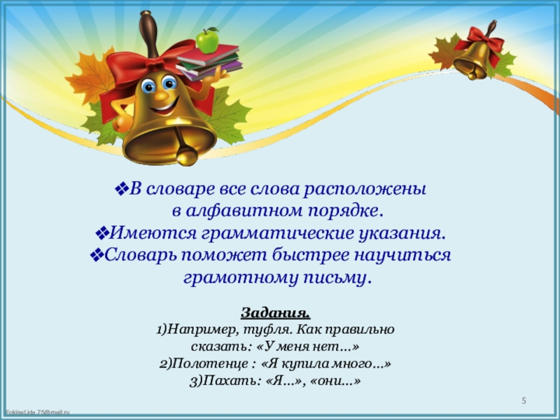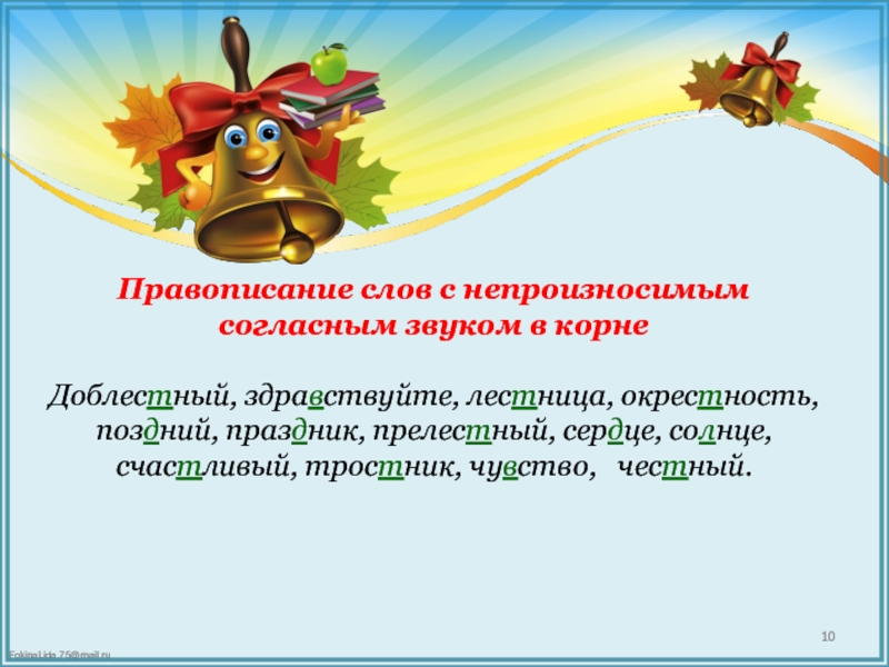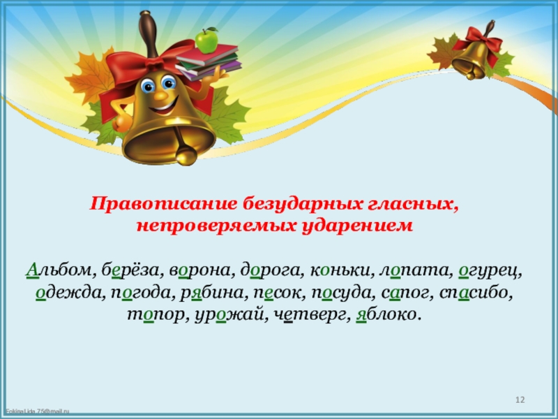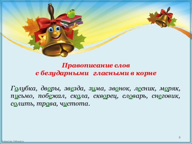 звонок, лесник, моряк, письмо, побежал, скала, скворец, словарь, снеговик, солить, трава, чистота.
