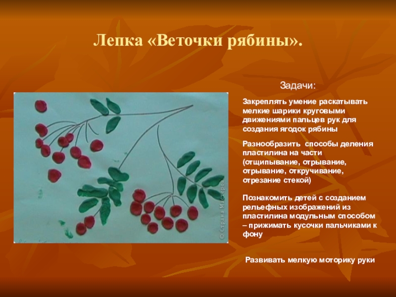 Познакомить детей с созданием рельефных изображений из пластилина модульным способом – прижимать кусочки пальчиками к фону
