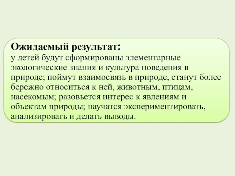Дошкольный возраст - самоценный этап в развитии экологической культуры человека. В этот период закладываются основы личности, в том числе позитивное отношение к природе, окружающему миру. Благодаря этому возможны формирование у детей экологических знаний, норм и правил взаимодействия с природой, воспитание сопереживания к ней, активность в решении некоторых экологических проблем.
