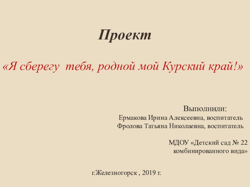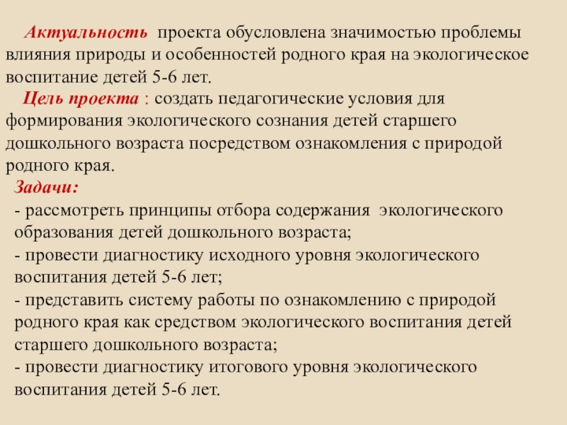 Цель проекта : создать педагогические условия для формирования экологического сознания детей старшего дошкольного возраста посредством ознакомления с природой родного края.