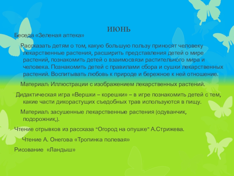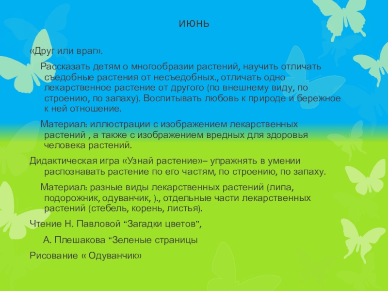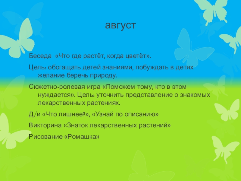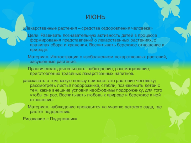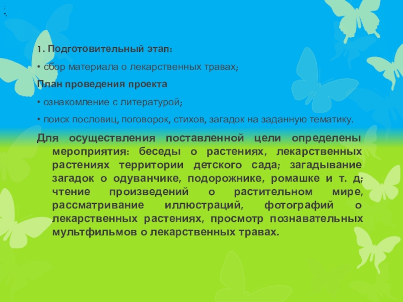 Для осуществления поставленной цели определены мероприятия: беседы о растениях, лекарственных растениях территории детского сада; загадывание загадок о одуванчике, подорожнике, ромашке и т. д; чтение произведений о растительном мире, рассматривание иллюстраций, фотографий о лекарственных растениях, просмотр познавательных мультфильмов о лекарственных травах.