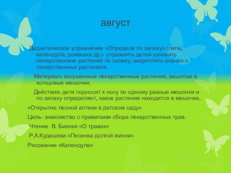 приносят человеку лекарственные растения, расширить представления детей о мире растений, познакомить детей о взаимосвязи растительного мира и человека. Познакомить детей с правилами сбора и сушки лекарственных растений. Воспитывать любовь к природе и бережное к ней отношение.
