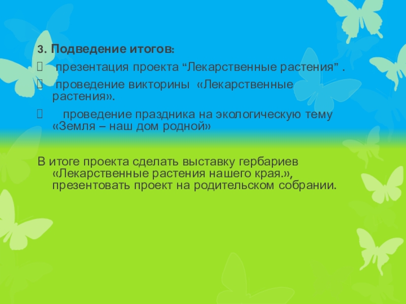 В итоге проекта сделать выставку гербариев «Лекарственные растения нашего края.», презентовать проект на родительском собрании.