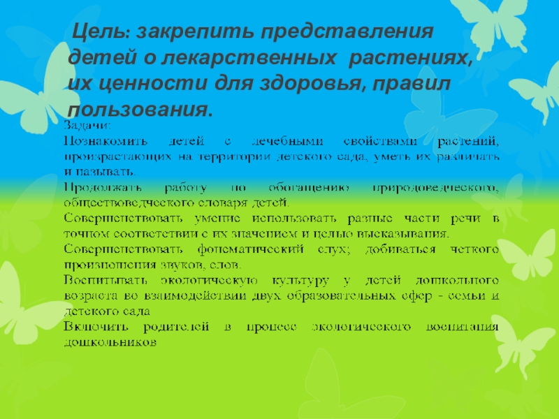 Слайд 2 Цель: закрепить представления детей о лекарственных растениях, их ценности для
