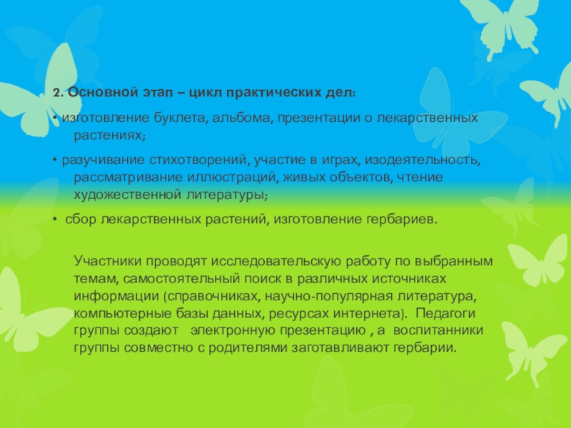 Участники проводят исследовательскую работу по выбранным темам, самостоятельный поиск в различных источниках информации (справочниках, научно-популярная литература, компьютерные базы данных, ресурсах интернета). Педагоги группы создают электронную презентацию , а воспитанники группы совместно с родителями заготавливают гербарии.