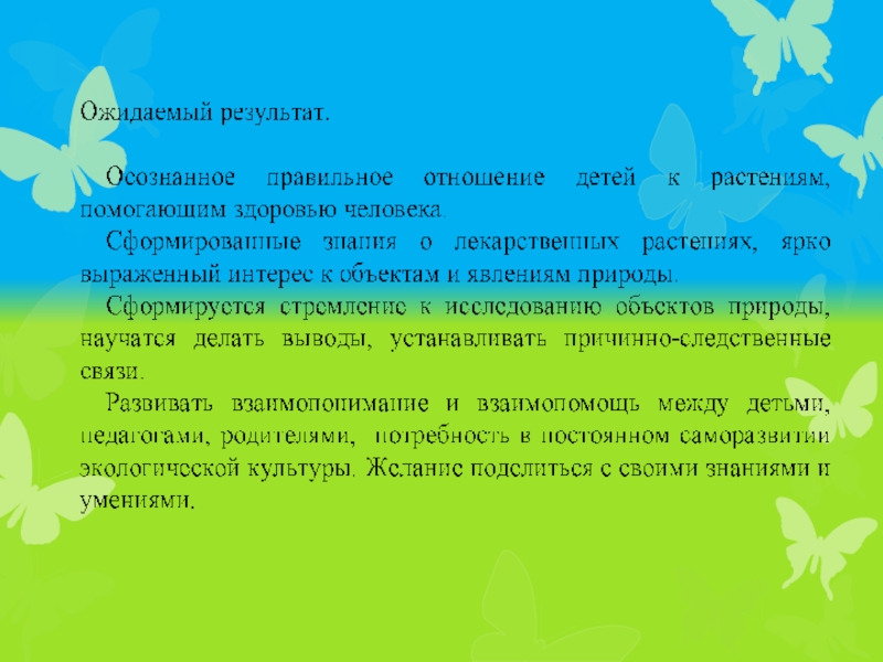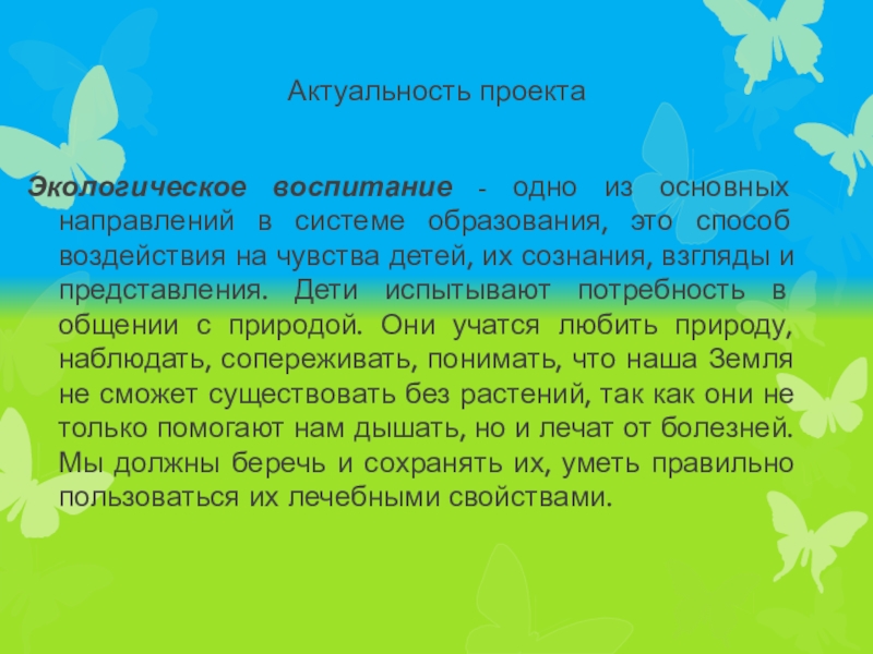 это способ воздействия на чувства детей, их сознания, взгляды и представления. Дети испытывают потребность в общении с природой. Они учатся любить природу, наблюдать, сопереживать, понимать, что наша Земля не сможет существовать без растений, так как они не только помогают нам дышать, но и лечат от болезней. Мы должны беречь и сохранять их, уметь правильно пользоваться их лечебными свойствами.