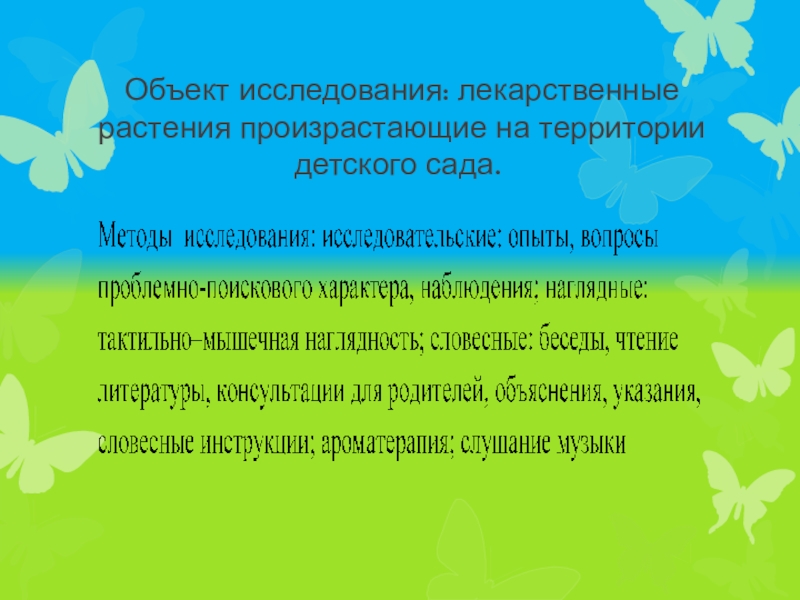Слайд 6 Объект исследования: лекарственные растения произрастающие на территории детского сада.