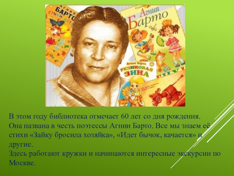 В этом году библиотека отмечает 60 лет со дня рождения.Она названа в честь поэтессы Агнии Барто. Все
