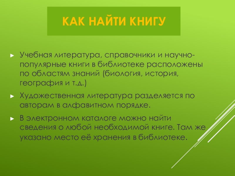 КАК НАЙТИ КНИГУУчебная литература, справочники и научно-популярные книги в библиотеке расположены по областям знаний (биология, история, география