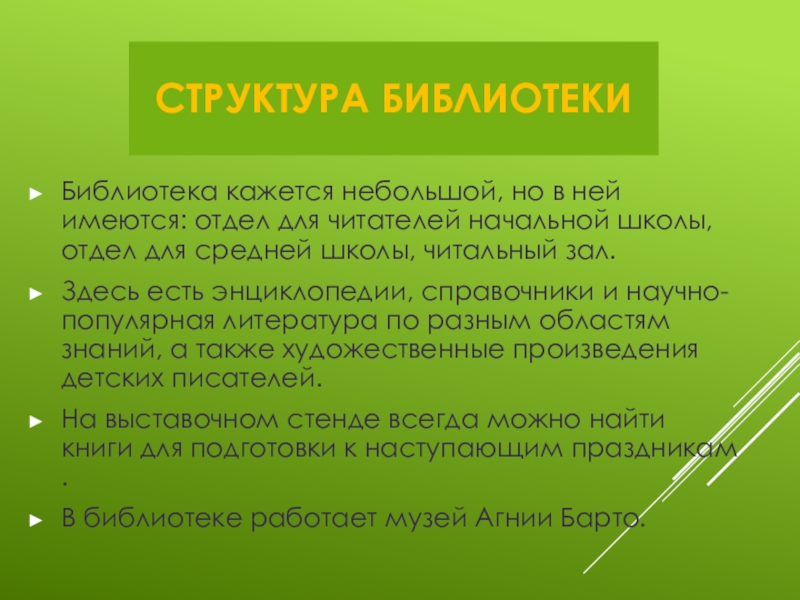 СТРУКТУРА БИБЛИОТЕКИБиблиотека кажется небольшой, но в ней имеются: отдел для читателей начальной школы, отдел для средней школы,
