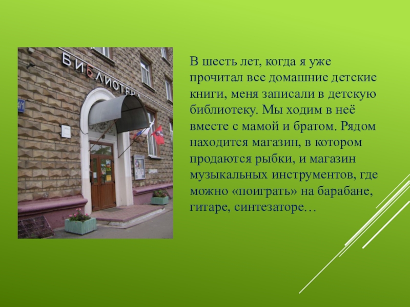 В шесть лет, когда я уже прочитал все домашние детские книги, меня записали в детскую библиотеку. Мы ходим в неё вместе с мамой и братом. Рядом находится магазин, в котором продаются рыбки, и магазин музыкальных инструментов,