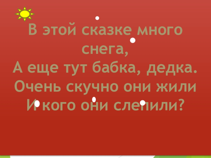В этой сказке много снега,А еще тут бабка, дедка.Очень скучно они жилиИ кого они слепили?