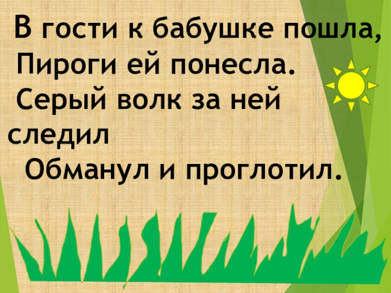 В гости к бабушке пошла, Пироги ей понесла. Серый волк за ней следил Обманул и проглотил.
