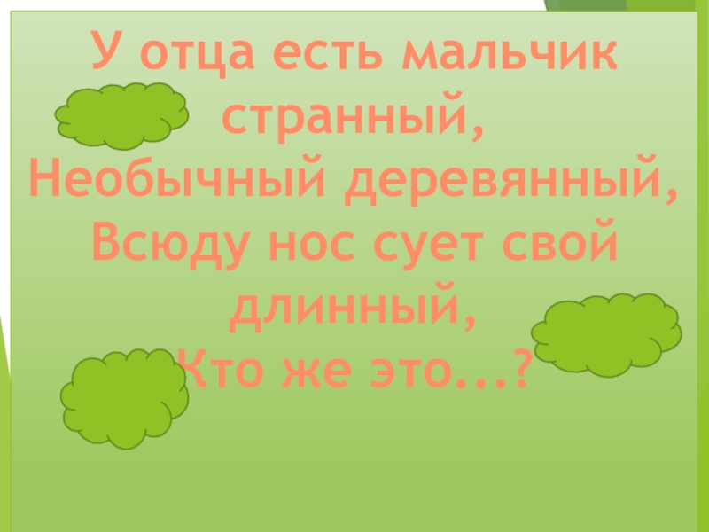 У отца есть мальчик странный,Необычный деревянный,Всюду нос сует свой длинный,Кто же это...?