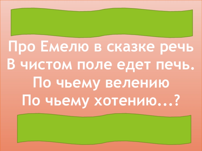 Про Емелю в сказке речьВ чистом поле едет печь.По чьему велениюПо чьему хотению...?