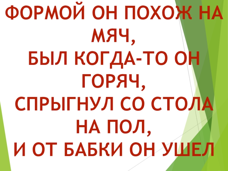 Формой он похож на мяч,Был когда-то он горяч,Спрыгнул со стола на пол,И от бабки он ушел