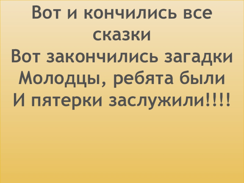 Вот и кончились все сказкиВот закончились загадкиМолодцы, ребята былиИ пятерки заслужили!!!!