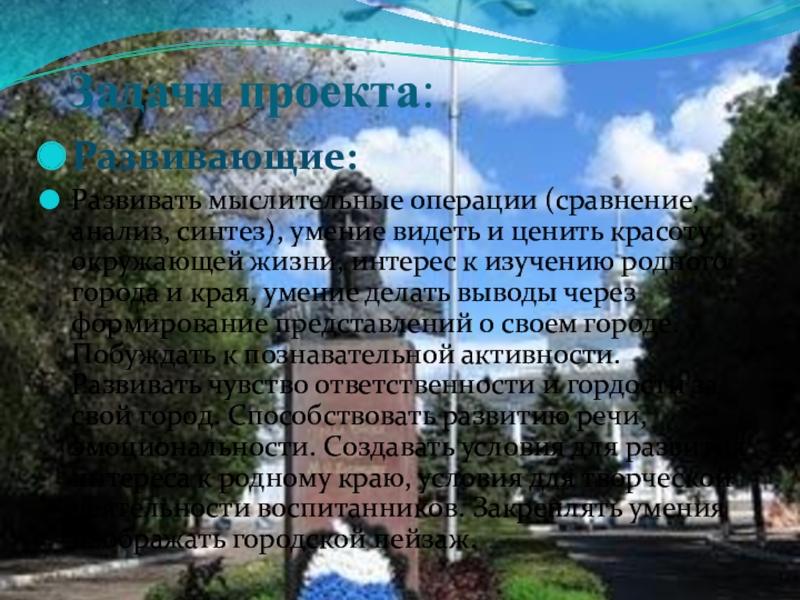 знания и представления детей старшего дошкольного возраста о его особенностях и достопримечательностях. Поможет сильнее почувствовать любовь к своей малой Родине, рассмотреть его красоту, задуматься о необходимости и важности беречь свой родной город, сохранить его архитектурное наследие, а также побуждать в детях желание приумножать внешний облик города и ценить его достопримечательности.