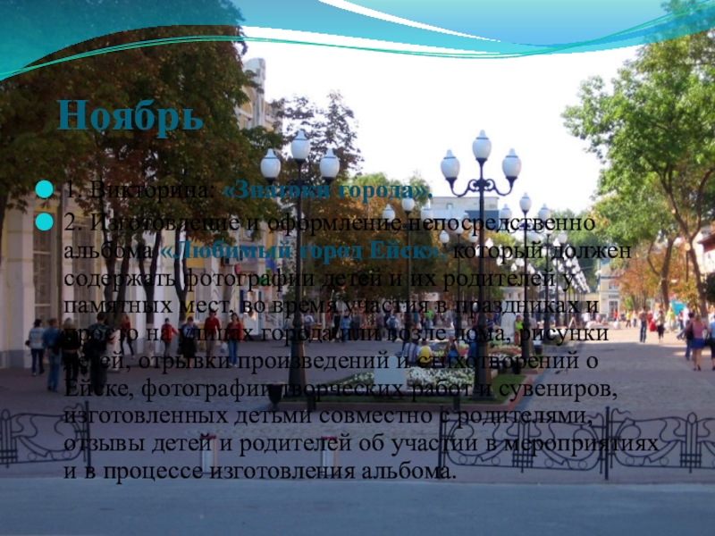 Ейск», который должен содержать фотографии детей и их родителей у памятных мест, во время участия в праздниках и просто на улицах города или возле дома, рисунки детей, отрывки произведений и стихотворений о Ейске, фотографии творческих работ и сувениров, изготовленных детьми совместно с родителями, отзывы детей и родителей об участии в мероприятиях и в процессе изготовления альбома.