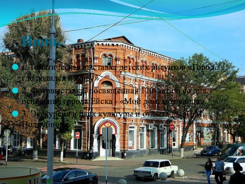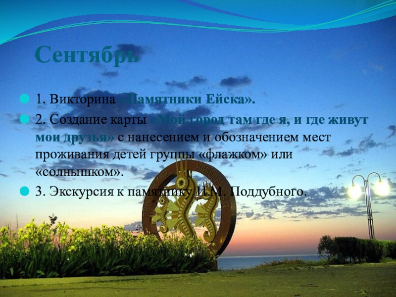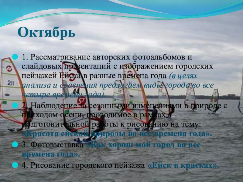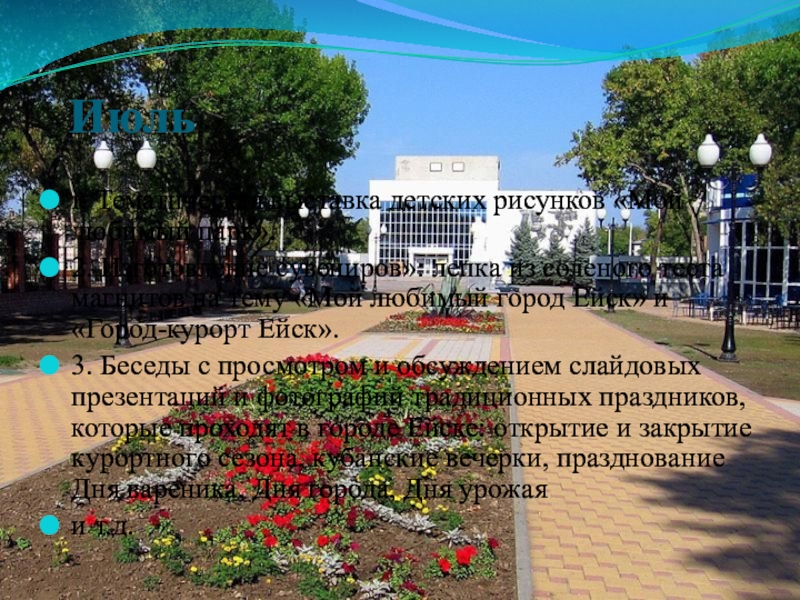 3. Беседы с просмотром и обсуждением слайдовых презентаций и фотографий традиционных праздников, которые проходят в городе Ейске: открытие и закрытие курортного сезона, кубанские вечерки, празднование Дня вареника, Дня города, Дня урожая