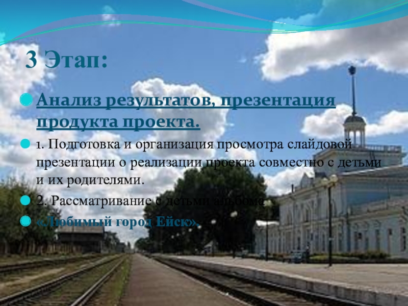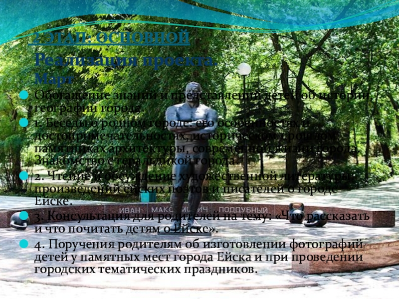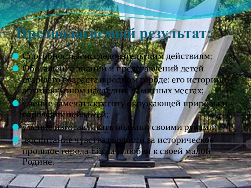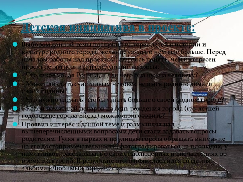 Проявив интерес к данной теме и размышляя над вышеперечисленными вопросами дети стали задавать вопросы родителям. Гуляя в парках и по улицам города обращать внимание на его достопримечательности, фотографироваться на площадях, у памятников, рассказывать о своих наблюдениях и впечатлениях во время экскурсий. В результате этого появилась идея создания альбома «Любимый город Ейск».
