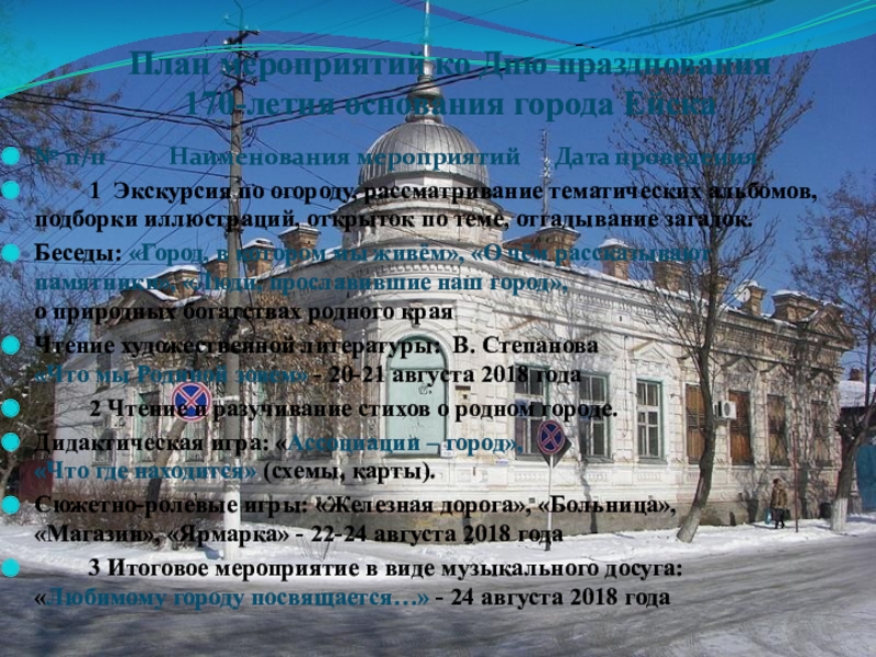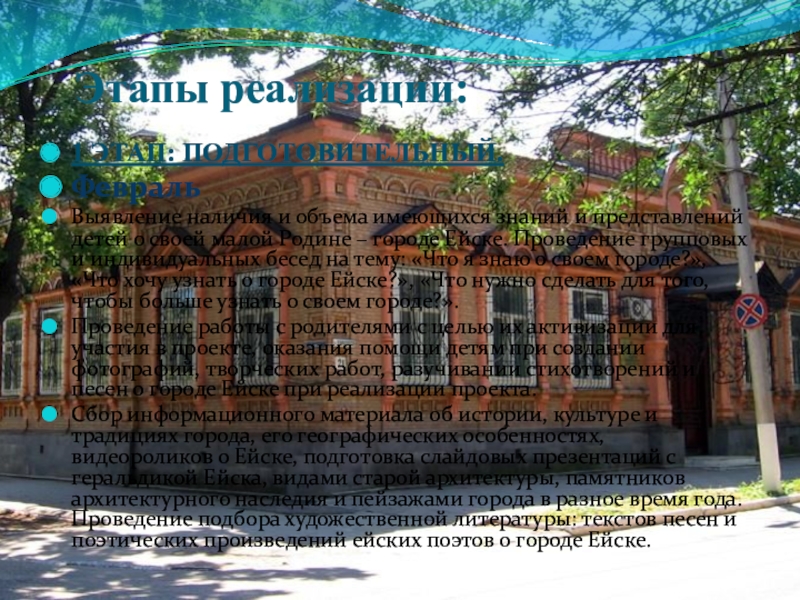 Сбор информационного материала об истории, культуре и традициях города, его географических особенностях, видеороликов о Ейске, подготовка слайдовых презентаций с геральдикой Ейска, видами старой архитектуры, памятников архитектурного наследия и пейзажами города в разное время года. Проведение подбора художественной литературы: текстов песен и поэтических произведений ейских поэтов о городе Ейске.